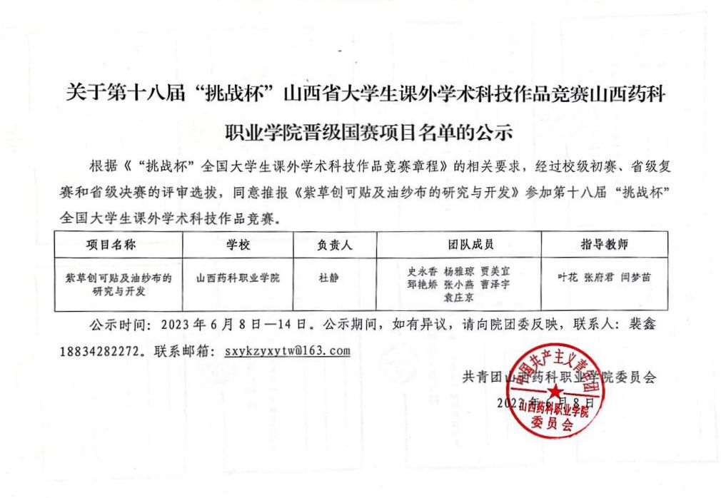 关于第十八届“挑战杯”山西省大学生课外学术科技作品竞赛beat365在线体育官网登录入口晋级国赛项目名单的公示