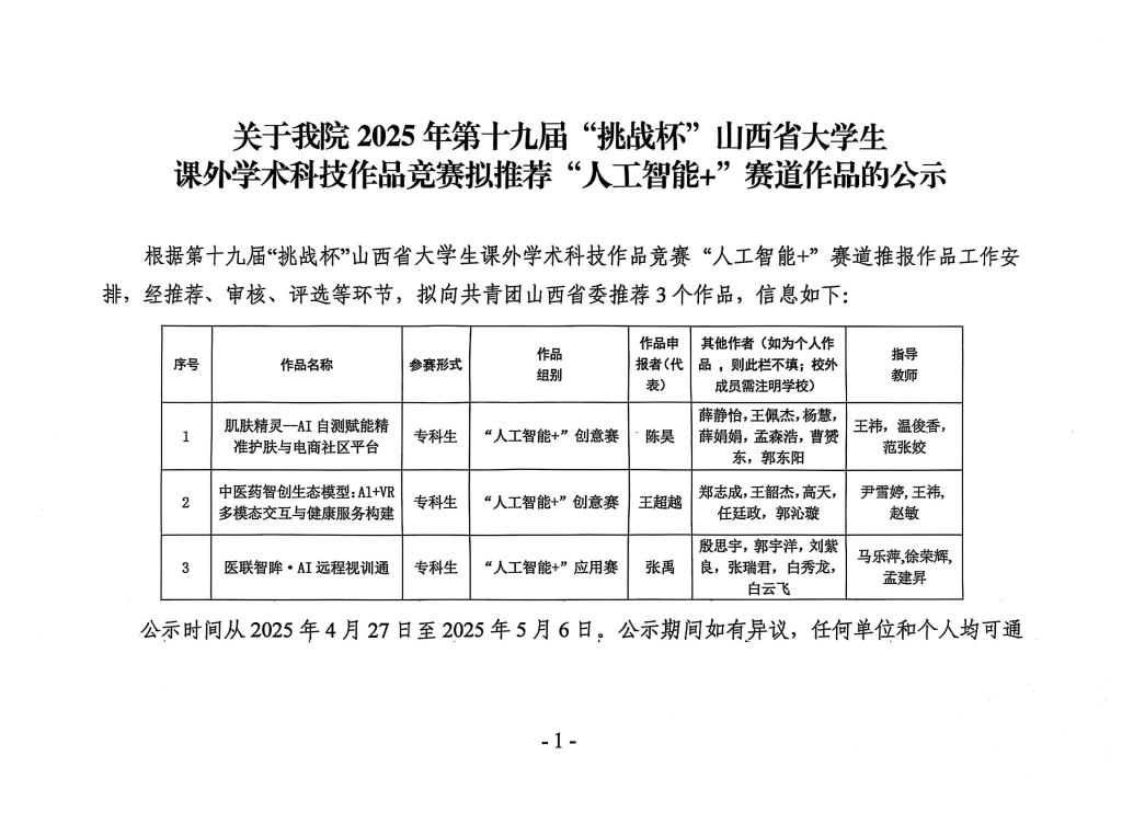 关于beat365官网2025年第十九届“挑战杯”山西省大学生课外学术科技作品竞赛拟推荐“人工智能+”赛道作品的公示