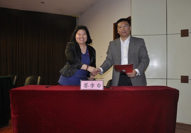 图为院团委副书记李一奇代表学院与团省委青少年维权中心主任张华同志签订合作协议书