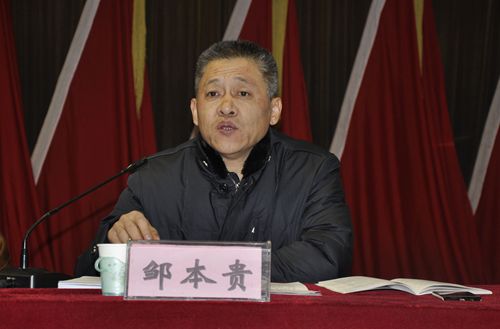 图为邹本贵同志交流发言