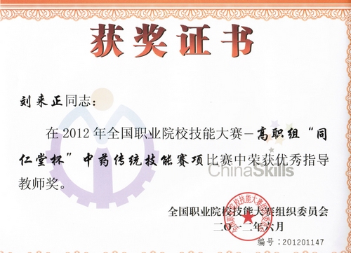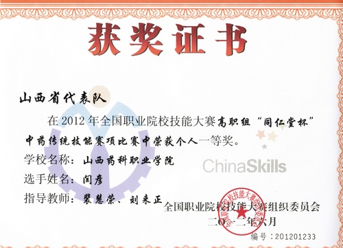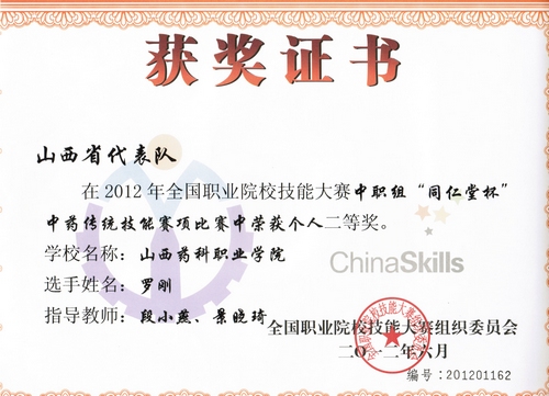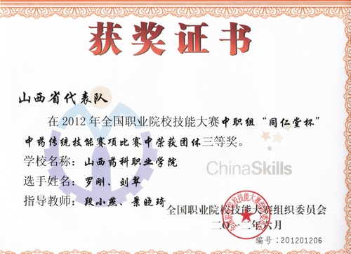 由国家教育部、国家中医药管理局联合举办的2012年全国职业院校技能大赛----“同仁堂杯”中药传统技能大赛于6月14日在山东中医药高等专科学校落下帷幕,beat365官网参赛选手表现不俗,喜获佳绩,取得历史性突破:荣获高职组团体一等奖、中职组团体三等奖;闫彦、范玉琴两名同学双双捧得高职组个人一等奖,罗刚同学荣获中职组个人二等奖;裴慧荣、刘来正两名教师分获优秀指导教师奖。