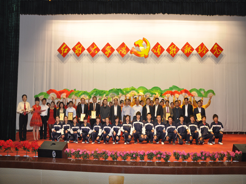 比赛结束后,省局领导与参赛代表队合影留念,并与全场师生齐唱《没有共产党就没有新中国》。