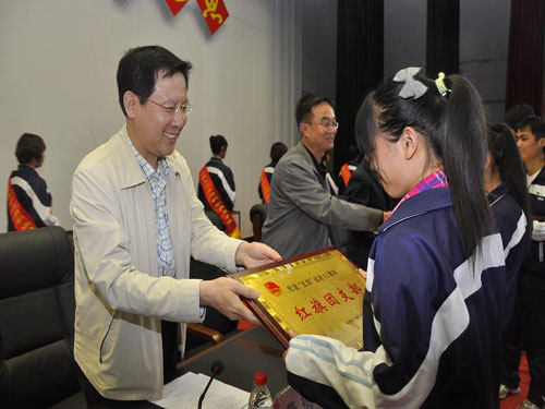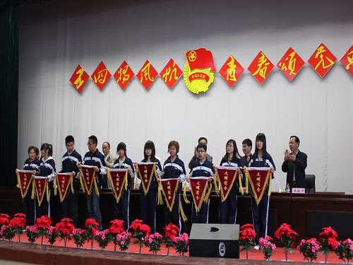 大会在嘹亮的国歌声中拉开帷幕。会上表彰了2010年度“五四红旗团支部”、“优秀共青团干部”、“优秀共青团员”、“优秀青年志愿者”、“文明教室”、“文明宿舍”、“文明学生”、“先进青年学生”等先进集体和优秀个人。出席大会的领导为获奖集体和个人代表颁奖并为新团员佩戴了团徽。全体新团员面对团旗举行了庄严而神圣的入团宣誓,参会老团员重温了入团誓词。