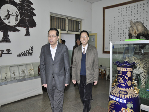 图为汤部长视察学院中药标本厅