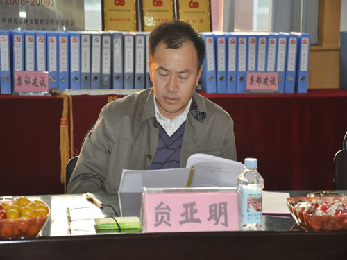 11月5日下午16:00时,以山西省食品药品监督管理局党组成员、总检验师贠亚明为组长的省创建文明和谐单位基层党务工作暨创先争优活动检查验收组一行三人莅临beat365官网检查指导工作。beat365官网党委副书记、院长李华荣,党委副书记、纪委书记龚晋文,党委委员、 副院长尹士优,党委委员、副院长胡尔雅,党委委员、副院长张震云,党委委员、组织人事部负责人冯晓中以及相关部门负责人参加了汇报会。