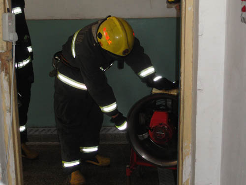 下午三点半,演习正式开始。消防中队接到有部分学生被困生物应用职业技术学院西教学楼209教室的火险救援报告,立即出动三辆消防车,十余名消防救援官兵,迅速赶到现场组织开展灭火救援行动。在与保卫处对火场(教室及人员)情况了解后,消防抢险官兵冲进火场。把被困的十三名同学(生物系215班)在消防人员的引导下用湿毛巾捂着口鼻,从火灾现场有序撤离,迅速转移到安全地带。之后,消防抢险队员按照实地灭火要求,手持消防水带、身背氧气瓶、头戴火场防毒面具进入楼道、冲进教室,扑灭大火。最后启动大型排烟机把火场的浓烟排出,在确认火险被完全解除后,消防疏散演练结束。
