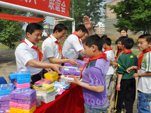 图为院团委干部为小学生捐赠学习用品