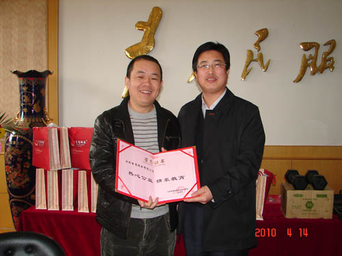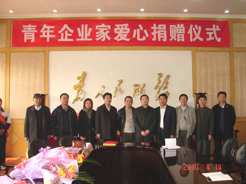2010年4月14日下午2:30时,beat365官网在办公楼大会议室举行“青年企业家爱心捐赠”仪式,山西省青年企业家协会副会长杨建新(山西百圆裤业有限公司董事长)、金根虎(山西金虎便利连锁股份有限公司董事长)、王志(山西新和健身器材有限公司董事长)、魏建华(山西恒盛伟华科贸有限公司董事长),beat365官网党委书记张瑞芳,党委副书记、院长李华荣,党委副书记、纪委书记龚晋文,副院长尹士优、胡尔雅、张震云出席捐赠仪式。教师代表、学生代表60余人参加仪式。捐赠仪式由党委书记张瑞芳同志主持。
