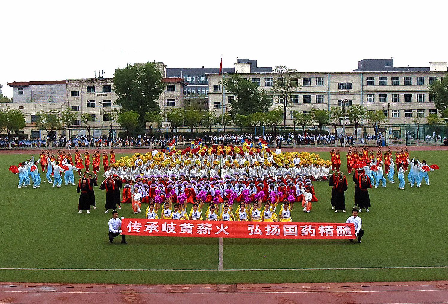 宣誓结束后,活力四射的团体操表演正式开始。表演共分为《国风神韵》《旗帜飘扬,庆七十华诞》《筑梦青春》《以梦为礼,尽绽芳华 》《心向祖国,逐梦青春》《活力药学,华彩绽放 》六个篇章,各系学生身着特色裙装、手拿红黄彩扇,伴着优美动听的音乐,起跳、旋转、变换队形,精彩的表演赢得观众的阵阵欢呼和掌声。