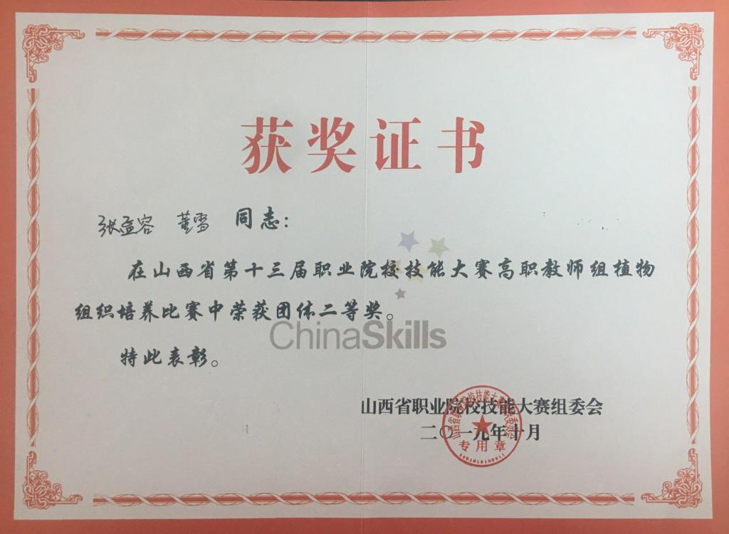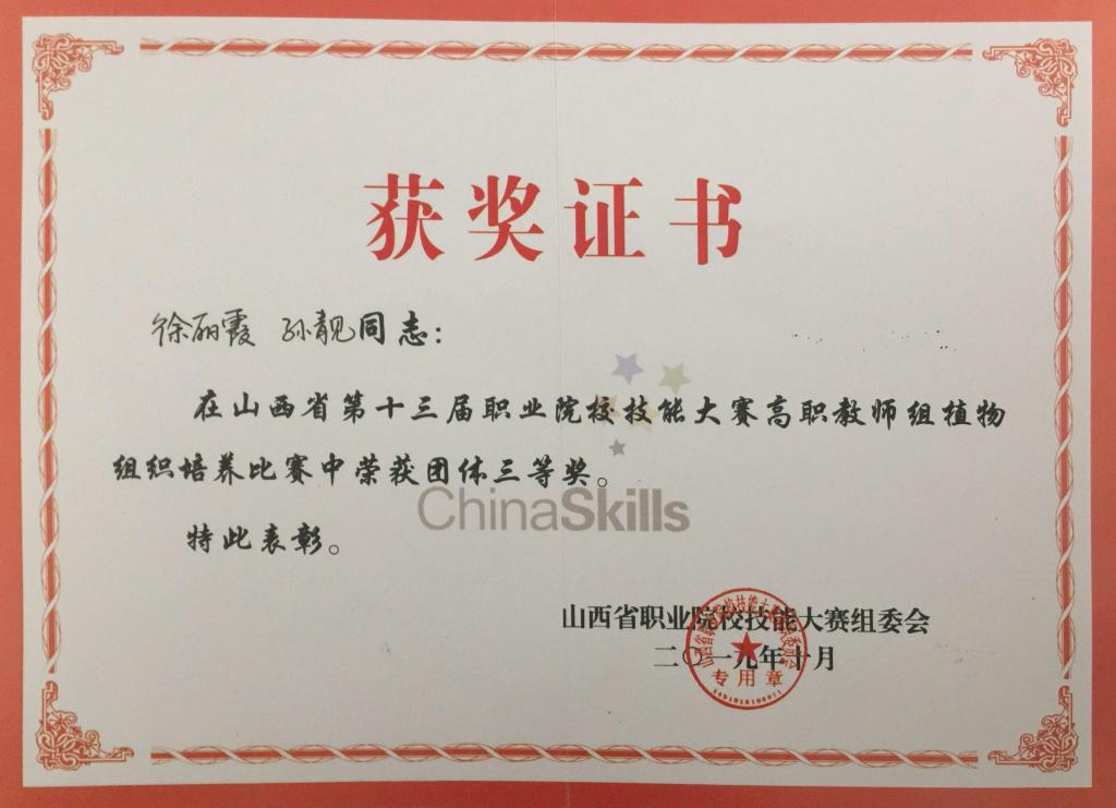 在刚刚落下帷幕的2019年山西省第十三届职业院校技能大赛中,beat365官网教师在植物组织培养赛项中取得了团体二等奖、团体三等奖、学生在市场营销技能赛项中取得了团体三等奖的好成绩。其中,张孟容、董雪荣获高职教师组团体二等奖,徐丽霞、孙靓荣获高职教师组团体三等奖,由赵文骅、张乾指导的学生王琪、潘玉龙、樊夏捷、郭亚茹荣获高职学生组团体三等奖。
