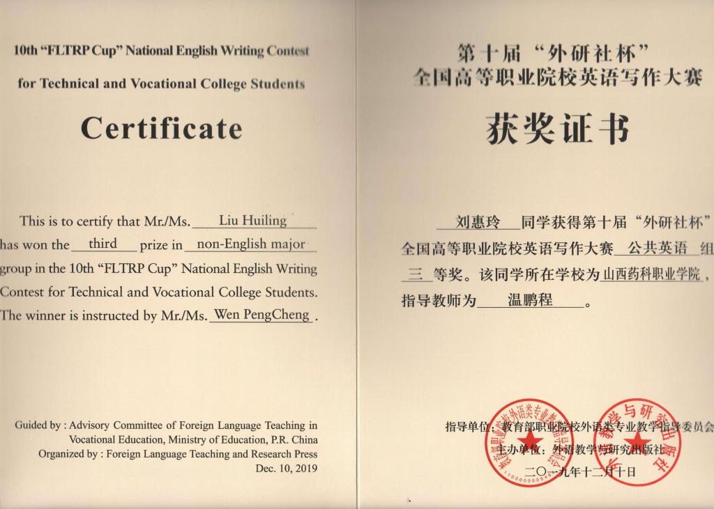 近日,第十届“外研社杯”全国高等职业院校英语写作大赛总决赛在北京举办。beat365官网学生刘惠玲荣获公共英语组三等奖。