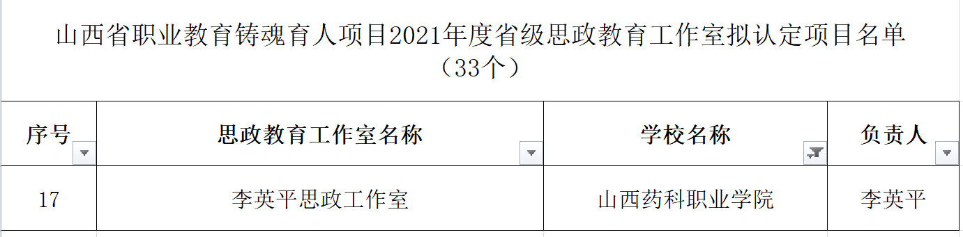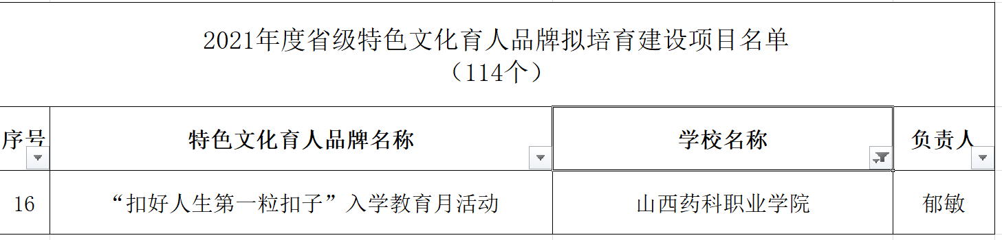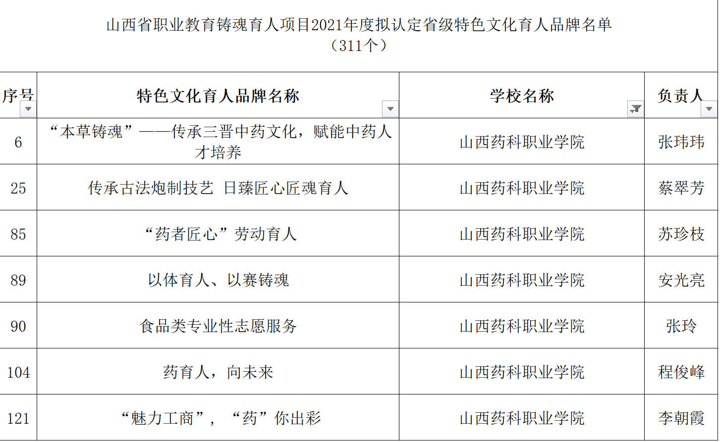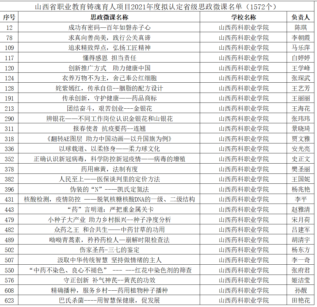 近日,山西省教育厅公布2021年度职业教育铸魂育人计划项目认定结果,beat365官网铸魂育人“三个一工程”建设喜获佳绩。“李英平思政工作室”被认定为省级职业教育思政教育工作室, “‘本草铸魂’——传承三晋中药文化,赋能中药人才培养”等7个项目被认定为省级职业教育特色文化育人品牌,《成功有密码—百年如磐赤子心》等28个微课被认定为省级职业教育思政微课,“‘扣好人生第一粒扣子’入学教育月活动”被认定为省级特色文化育人品牌培育建设项目。