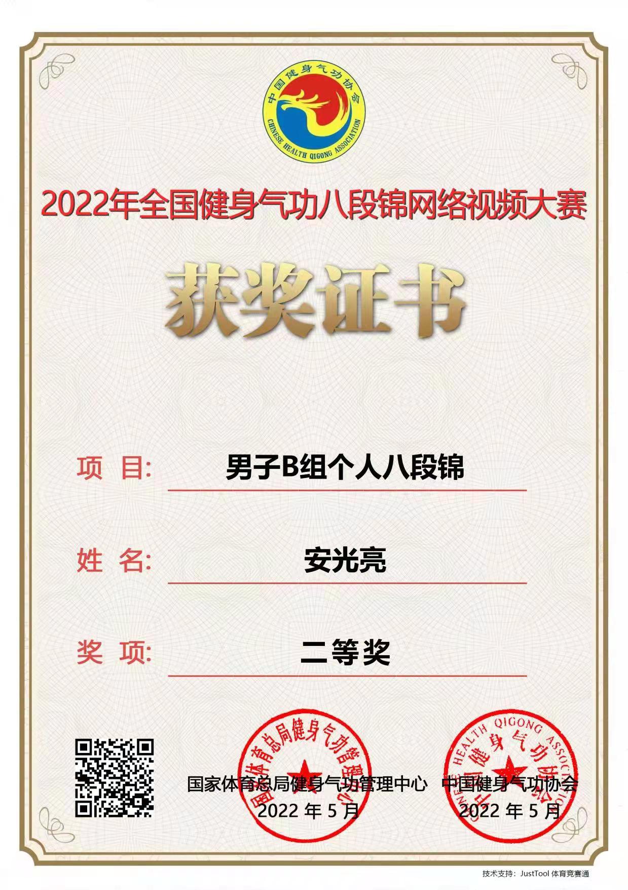 近日,由国家体育总局健身气功中心、中国健身气功协会组织的2022年全国健身气功八段锦网络视频大赛圆满闭幕,beat365官网公体部教师安光亮在此次比赛中获得了男子B组个人二等奖。