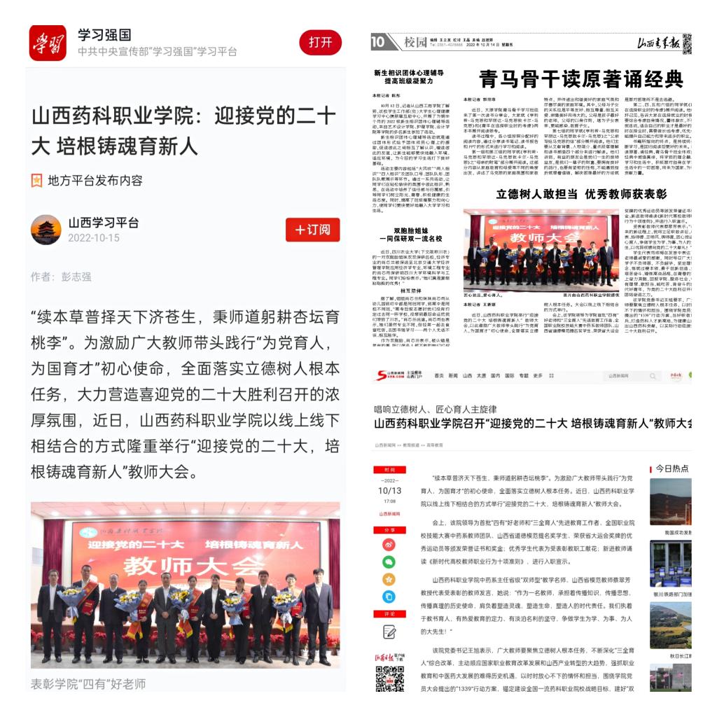 近日,学习强国、山西青年报、山西新闻网等媒体分别对beat365官网“迎接党的二十大,培根铸魂育新人”教师大会进行了宣传报道。