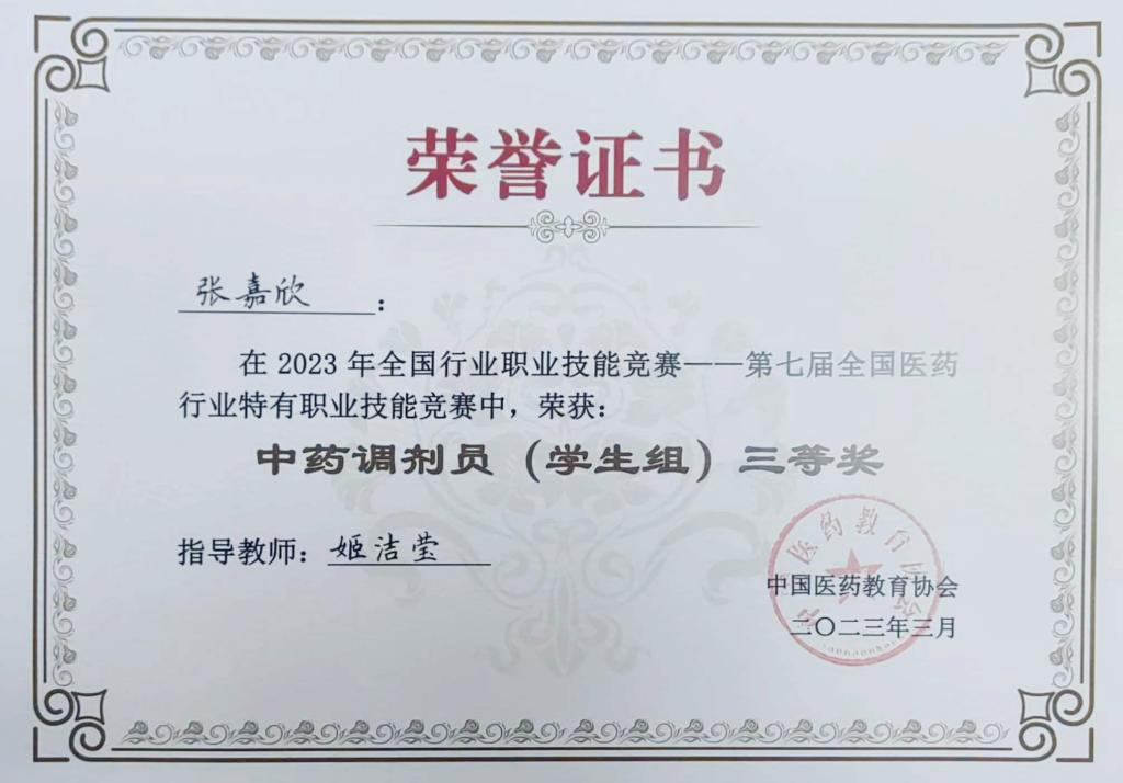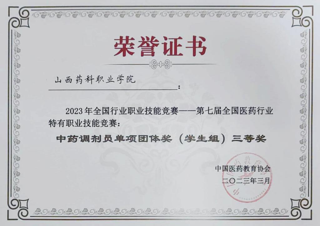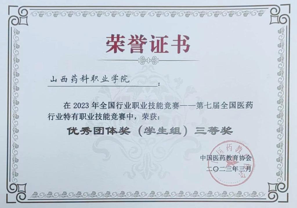 3月23-26日,2023年全国行业职业技能竞赛第七届全国医药行业特有职业技能竞赛中药调剂员赛项在江苏省连云港中医药高等职业技术学校举行,beat365官网中药系参赛学生刘成梅和张嘉欣分别荣获个人一等奖和三等奖,学院荣获中药调剂员单项团体奖(学生组)三等奖、优秀团体奖(学生组)三等奖和优秀组织奖。