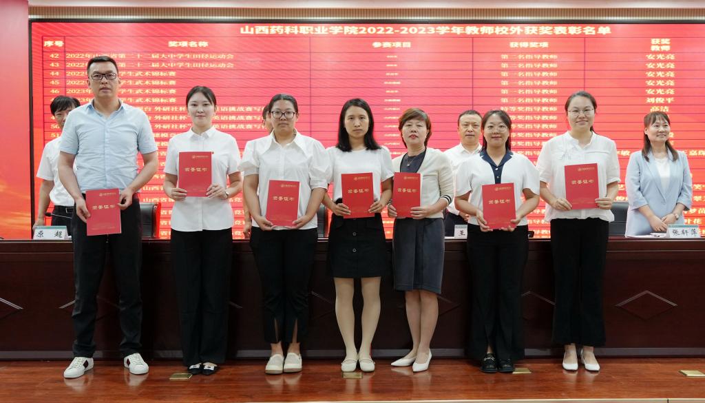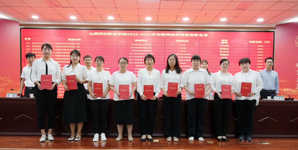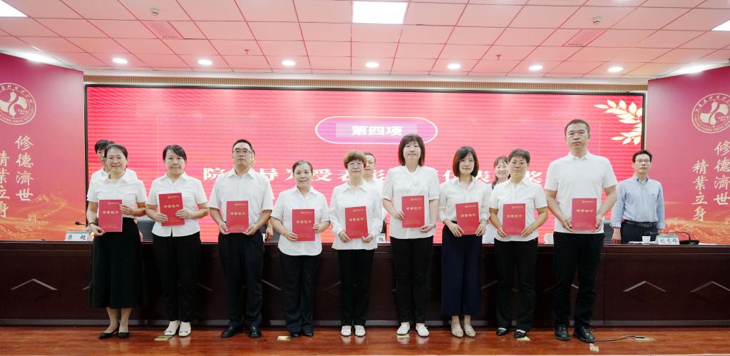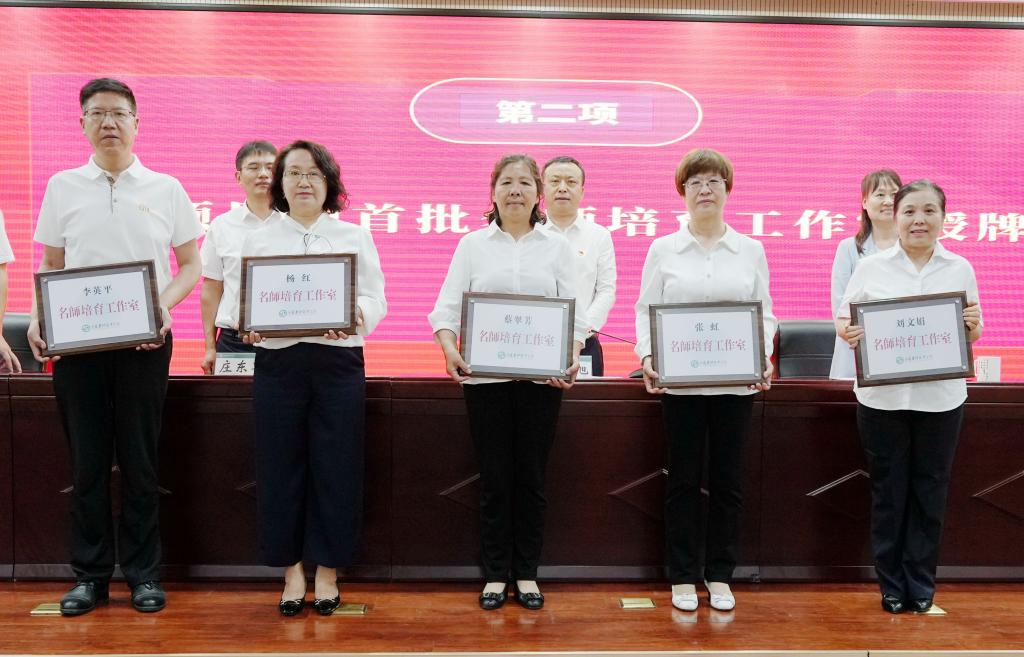 院领导为张虹教授、蔡翠芳教授、刘文娟教授、杨红教授、李英平副教授等5人颁授名师培育工作室牌匾,为获得国家级和省级奖项的教师代表颁发证书和奖金。