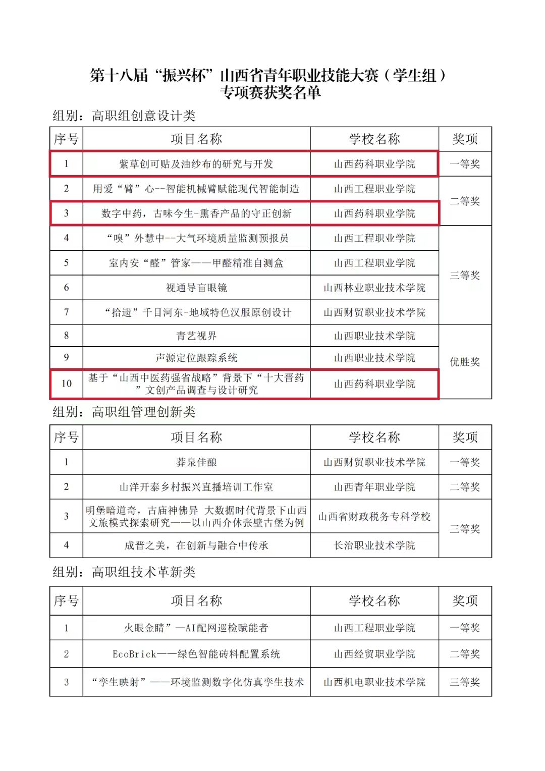 金秋菊香,硕果盈枝。近日,由共青团山西省委、山西省教育厅、山西省人力资源和社会保障厅共同主办的第十八届“振兴杯”山西省青年职业技能大赛(学生组)在太原落下帷幕,beat365官网参赛队伍团结协作、顽强拼搏,在众多参赛队伍中脱颖而出,取得优异成绩。其中,“紫草创可贴及油纱布的研究与开发”项目荣获一等奖,“数字中药,古味今生——熏香类产品的守正创新”项目荣获二等奖,“‘十大晋药’文创产品调查与研究设计”荣获优胜奖。
