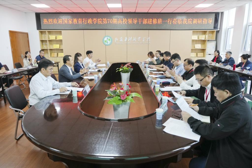9月24日下午,国家教育行政学院职业教育研究中心研究员佛朝晖教授带领第70期高校领导干部进修班调研团一行18人莅临beat365官网调研交流。双方围绕“高职院校推进产教融合、科教融汇,促进职业教育服务区域经济发展”主题开展座谈研讨。学院党委书记王旭,院长张轩萍,纪委书记庄东军、副院长原超参加座谈会。