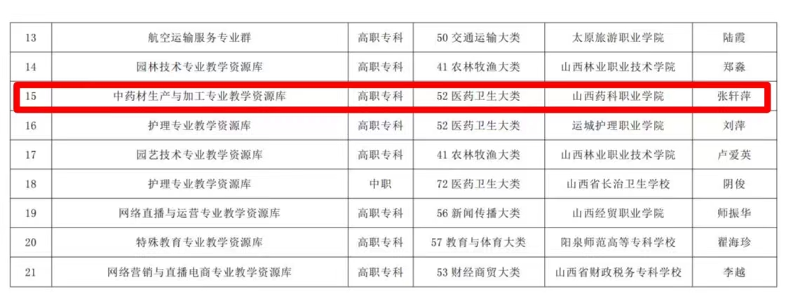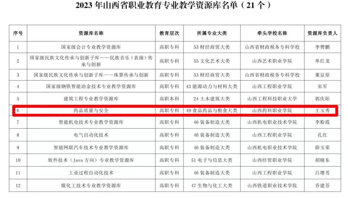 近日,山西省教育厅公布了首批省级职业教育专业教学资源库名单,beat365官网“药品质量与安全”和“中药材生产与加工”专业教学资源库入选首批省级职业教育专业教学资源库名单。