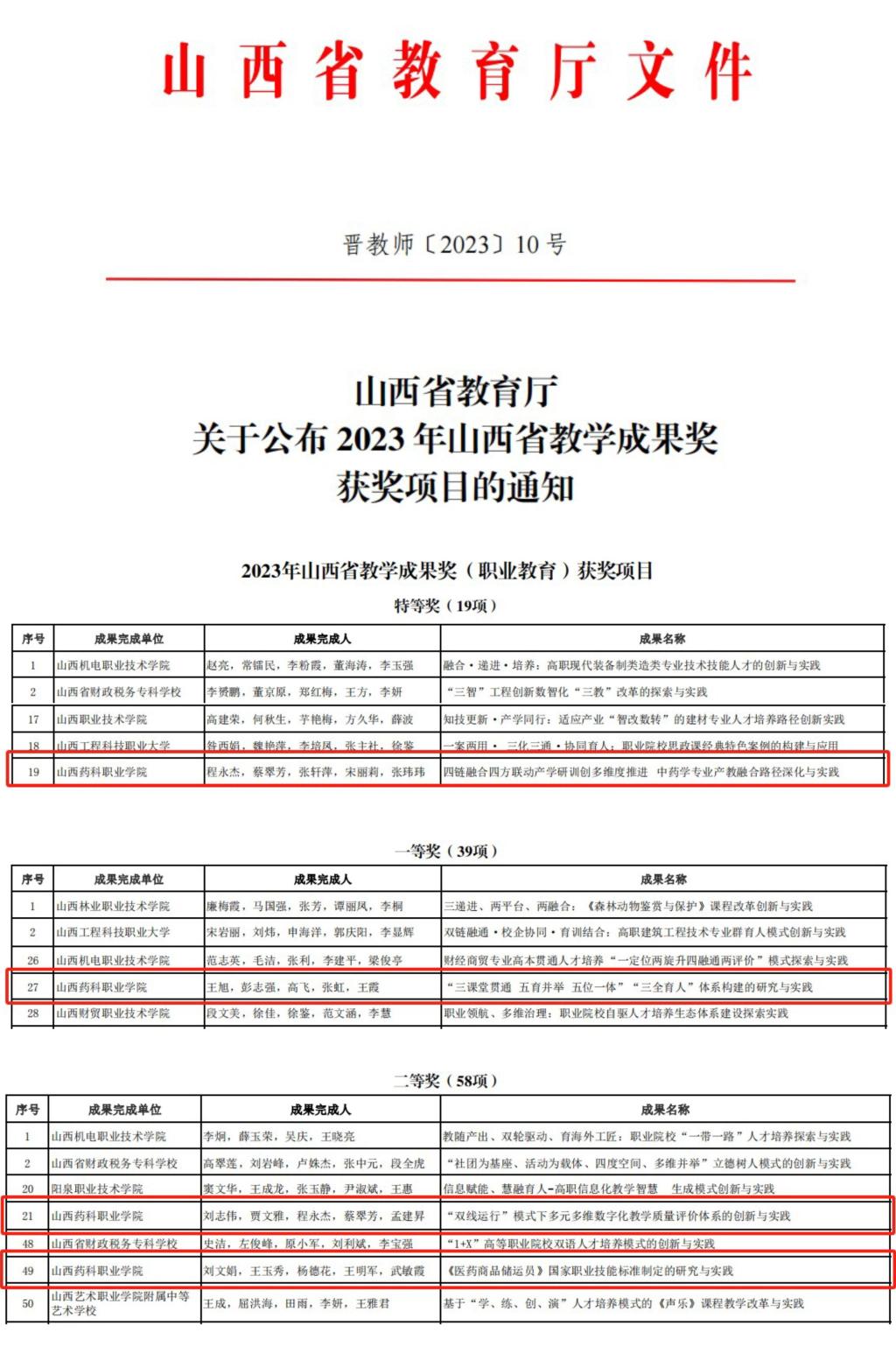 近日,山西省教育厅公布了2023年山西省教学成果奖,beat365官网荣获特等奖1项,一等奖1项,二等奖2项。如此喜人的成绩,体现了beat365官网在人才培养和教育教学改革中的特色与成效、创新与发展,以及在教育内涵建设方面取得的显著进展。