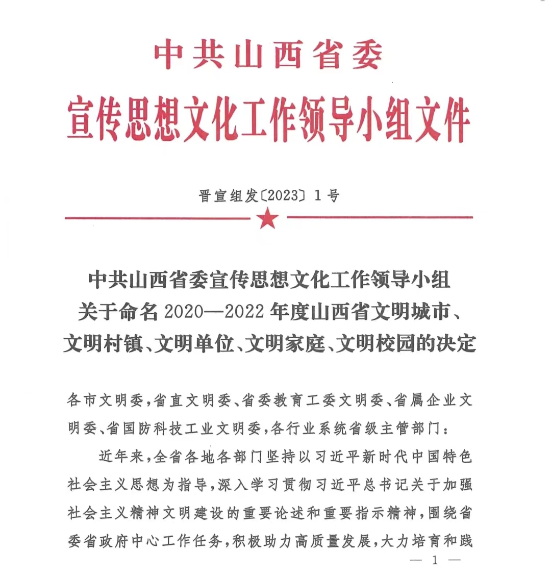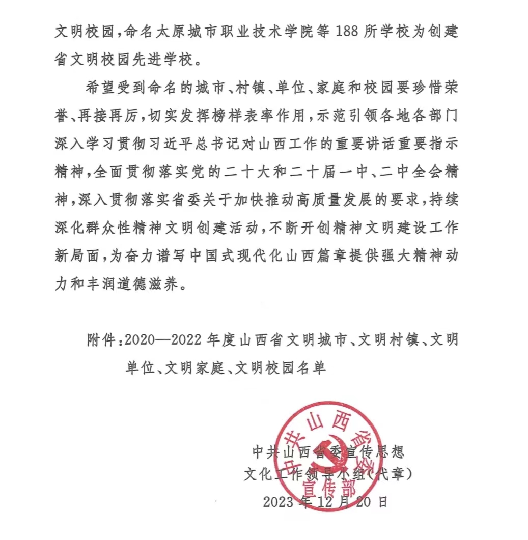 近日,中共山西省委宣传部下发《关于命名2020-2022年度山西省文明城市、文明村镇、文明单位、文明家庭、文明校园的决定》(晋宣组发〔2023〕1号),beat365官网荣获“山西省文明校园”称号。