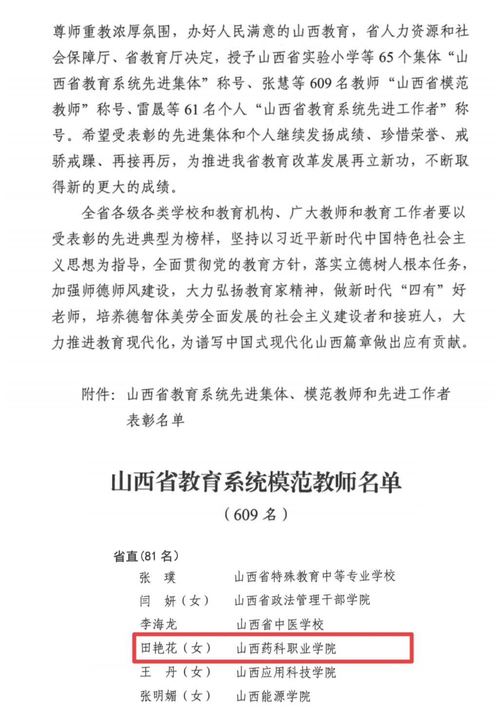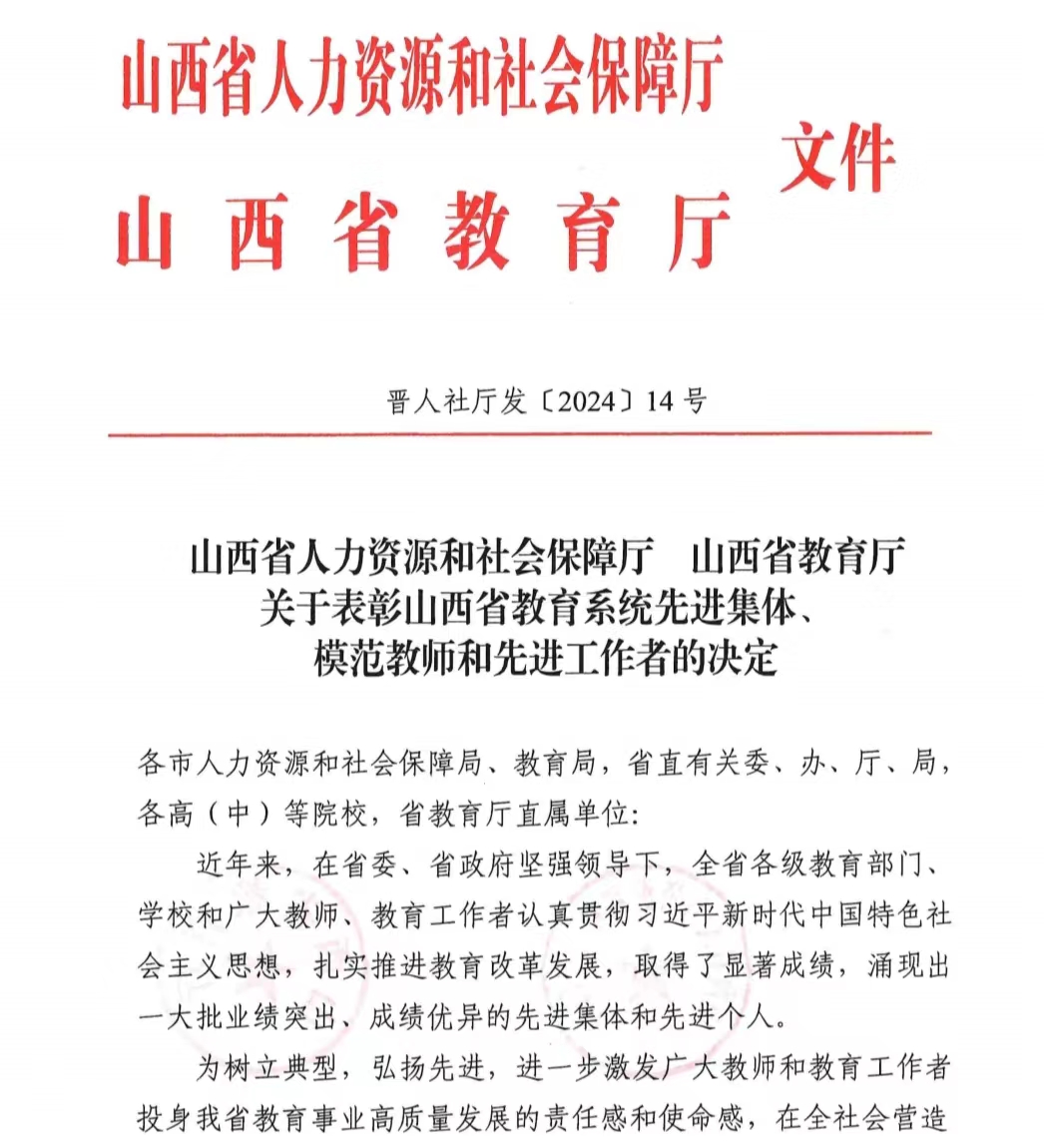 近日,山西省人力资源和社会保障厅、山西省教育厅联合下发《关于表彰山西省教育系统先进集体、模范教师和先进工作者的决定》(晋人社厅发[2024]14号),beat365官网田艳花老师荣获“山西省教育系统模范教师”称号。