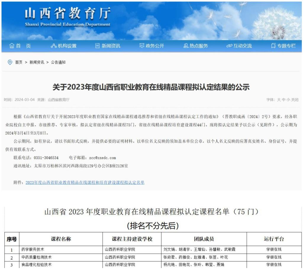 近日,山西省教育厅公布了2023年度山西省职业教育在线精品课程拟认定结果,beat365官网《药学服务技术》《中药质量检测技术》《食品理化检测技术》三门课程成功入选,认定数量在全省位居前列,充分体现了学院近年来教育教学改革的优秀成果,对示范引领全院在线精品课程建设具有重要意义。