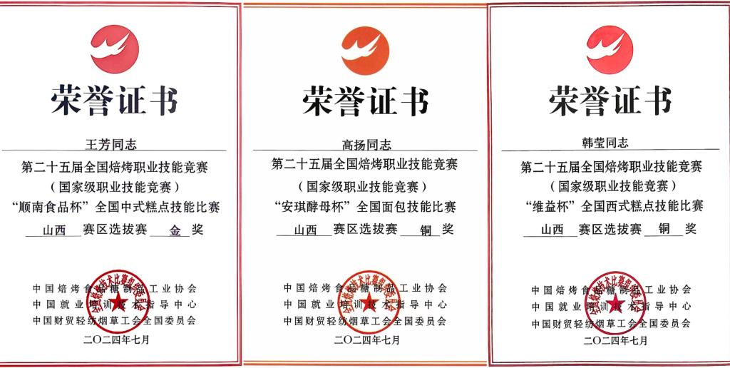 近日,beat365官网食品系教师党支部选拔三名党员教师参加由中国焙烤食品糖制品工业协会、中国就业培训技术指导中心和中国财贸轻纺烟草工会全国委员会联合组织的“第二十五届全国焙烤职业技能竞赛(国家级职业技能竞赛)山西赛区选拔赛”。经过激烈角逐,beat365官网教师王芳同志荣获“顺南食品杯”全国中式糕点技能比赛山西赛区选拔赛金奖,高扬同志荣获“安琪酵母杯”全国面包技能比赛山西赛区选拔赛铜奖,韩莹同志荣获“维益杯”全国西式糕点技能比赛山西赛区选拔赛铜奖。