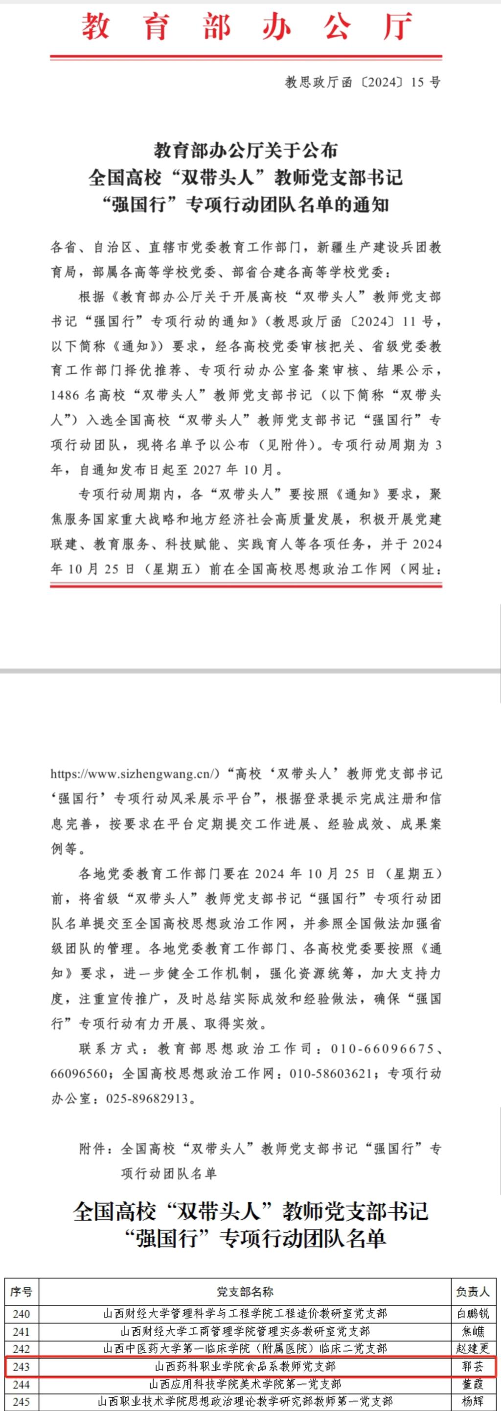 近日,教育部办公厅公布了全国高校“双带头人”教师党支部书记“强国行”专项行动团队名单,beat365官网食品系党总支教师党支部成功入选。