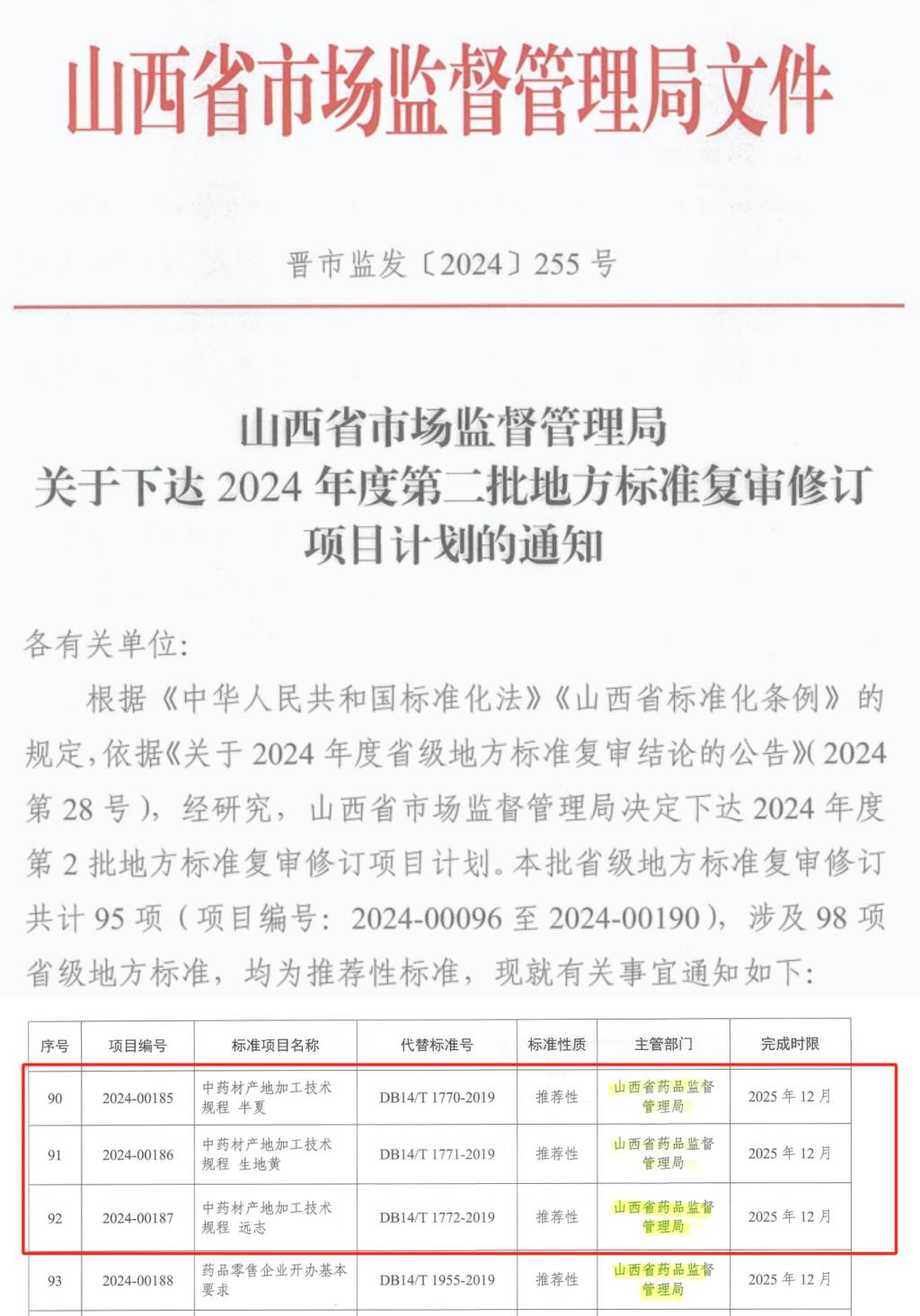 近日,山西省市场监督管理局印发《关于下达2024年度第二批地方标准复审修订项目计划的通知》(晋市监发〔2024〕255号),beat365官网蔡翠芳教授主持编写的《中药材产地加工技术规程 半夏》《中药材产地加工技术规程 生地黄》《中药材产地加工技术规程 远志》3项地方标准成功获批。