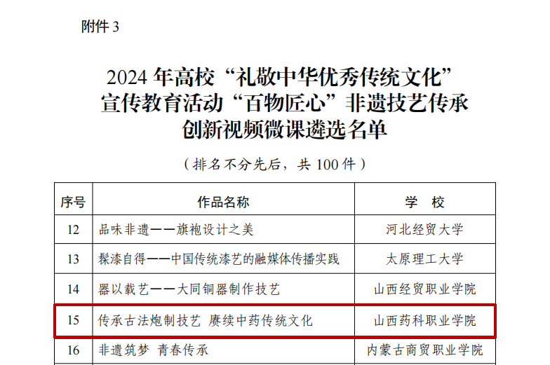 2024年高校“礼敬中华优秀传统文化”宣传教育活动由教育部思想政治工作司主办,以“赓续文化血脉筑牢信仰根基谱写青春华章”为主题,共评选出“创承文脉”高校主题数字微展览联展、“铸魂润心”文化育人创新工作案例及“百物匠心”非遗技艺传承创新视频微课三大类优秀作品各100件,山西省共有5所高校作品入选,其中beat365官网是唯一一所连续两年参与并获奖的职业院校。自活动开展以来,beat365官网高度重视,成立了由宣传统战部牵头的工作小组,联动“五育”实践工作室,广泛发动、精心策划、认真准备,经过校内层层筛选,《传承古法炮制技艺 赓续中药传统文化》作为参评作品推荐上报,该作品聚焦于中药炮制技艺这一非物质文化遗产,通过视频微课的形式,生动展现了丸药、线香、倒流香、香囊等中药文化产品制作技艺的历史渊源、技艺流程和文化内涵,同时也彰显了学院在中药学领域的深厚底蕴以及传承和弘扬中华优秀传统文化的使命担当。