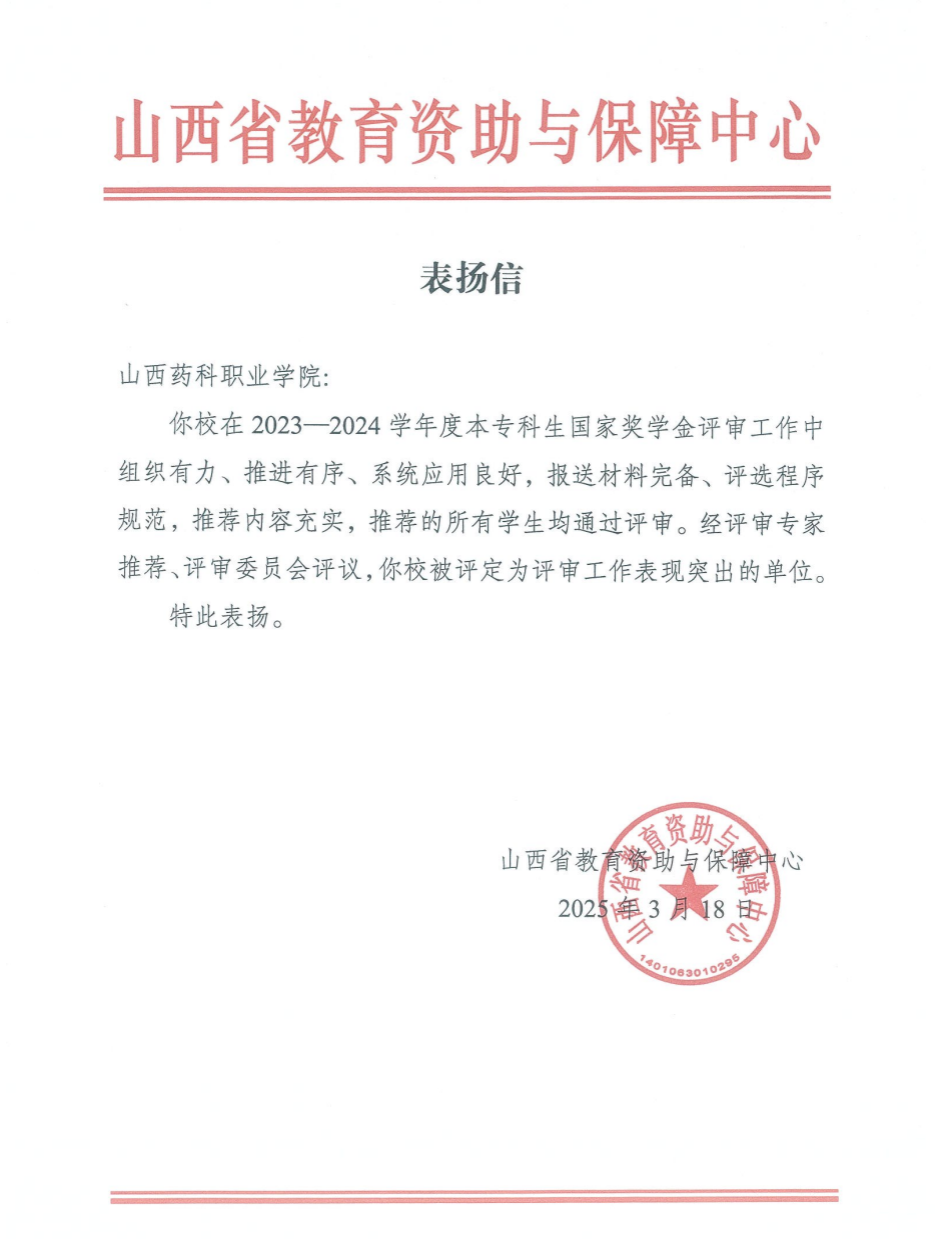 近日,山西省教育资助与保障中心向beat365官网发来表扬信,对beat365官网学生国家奖学金评审工作给予高度肯定。信中指出:你校在2023-2024 学年度本专科生国家奖学金评审工作中组织有力、推进有序、系统应用良好,报送材料完备、评选程序规范,推荐内容充实,推荐的所有学生均通过评审。经评审专家推荐、评审委员会评议,你校被评定为评审工作表现突出的单位。