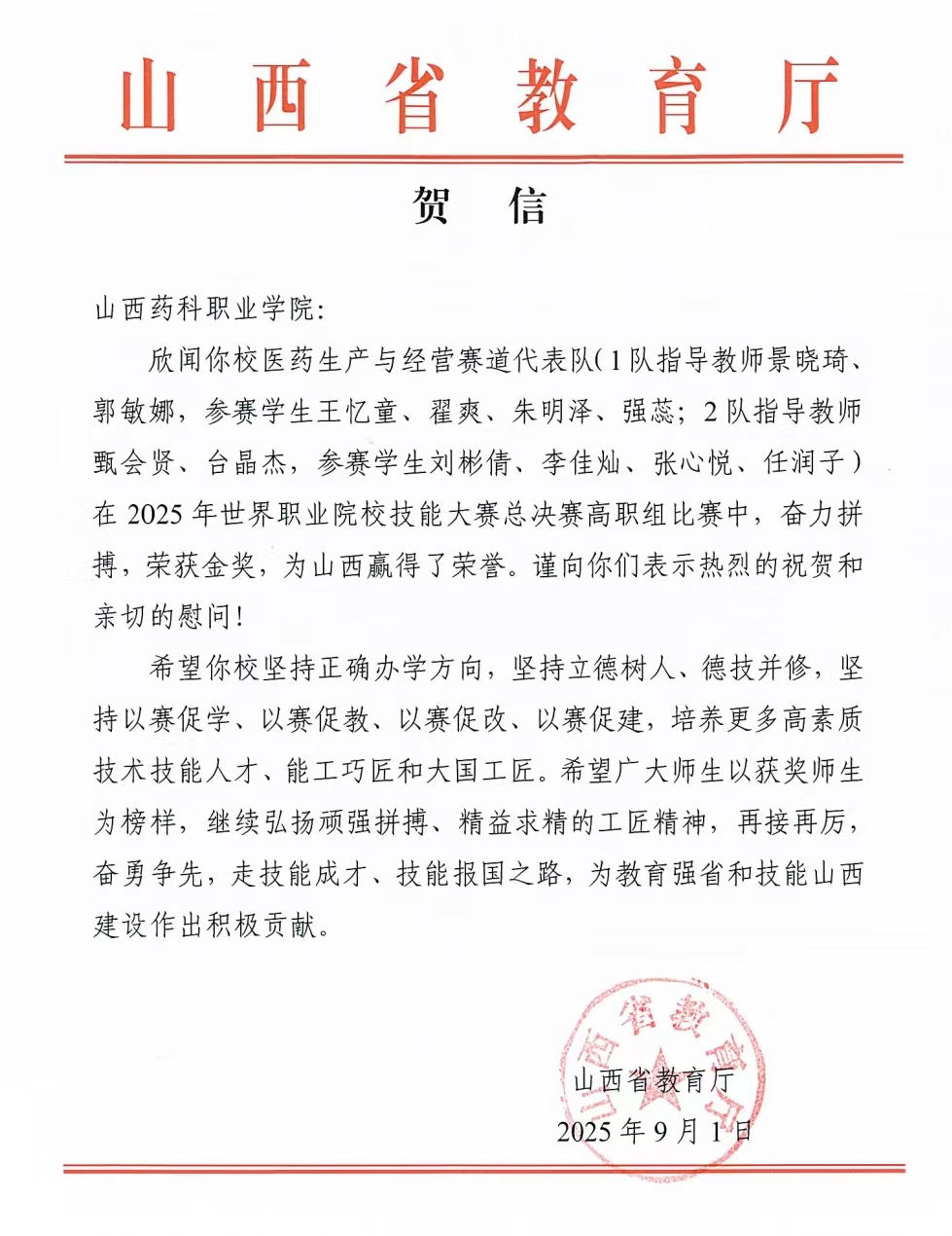 9月1日,山西省教育厅向beat365官网发来贺信,对beat365官网两支代表队在2025年世界职业院校技能大赛总决赛高职组医药生产与经营赛道中双双斩获金奖表示热烈祝贺。