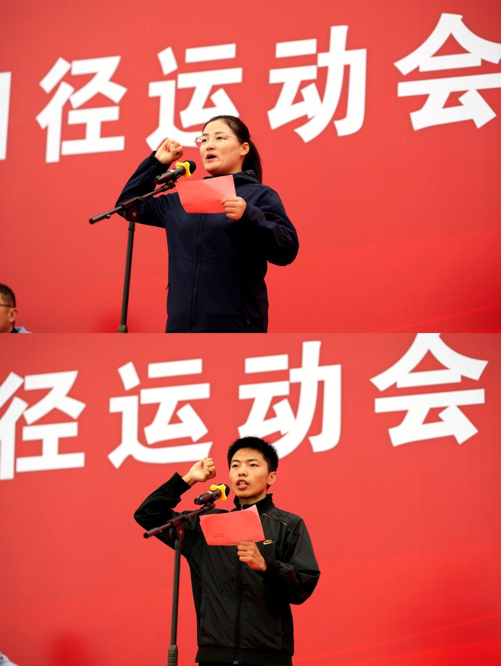 教师冯茜、学生杜智敏分别代表全体裁判员和运动员庄严宣誓,承诺恪守规则、公平竞技,展现体育精神。