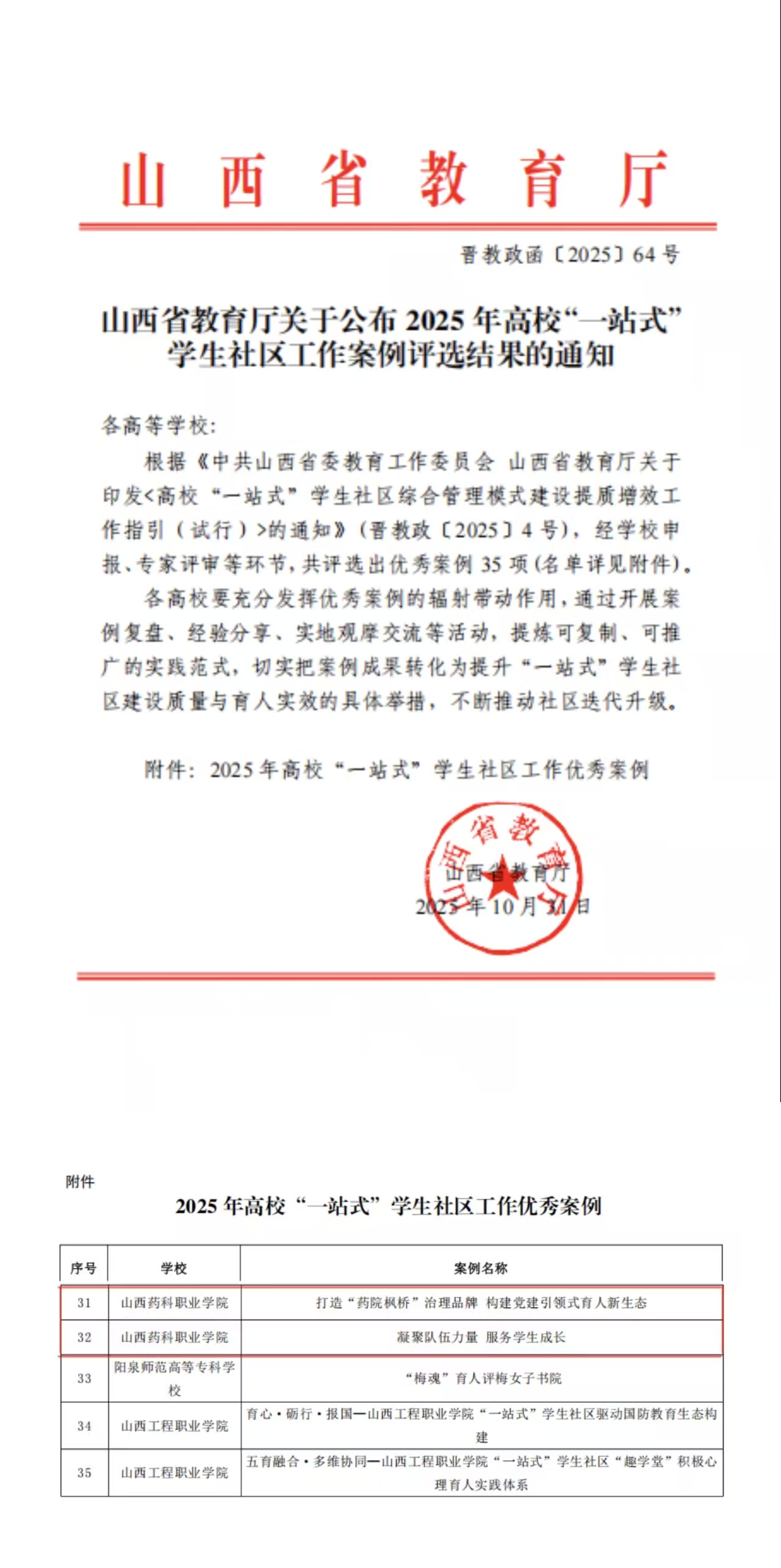 近日,山西省教育厅公布2025年度高校“一站式”学生社区工作案例评选结果,beat365官网申报的《打造“药院枫桥”治理品牌 构建党建引领式育人新生态》与《凝聚队伍力量 服务学生成长》两项案例成功入选。