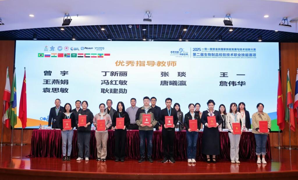 11月6日至9日,2025一带一路暨金砖国家技能发展与技术创新大赛第二届生物制品检验技术职业技能赛项在浙江经贸职业技术学院圆满落幕。beat365官网2024级生物制药技术2班学生任瑾、曾宇星斩获二等奖,老师张琰、王一荣获优秀指导教师。