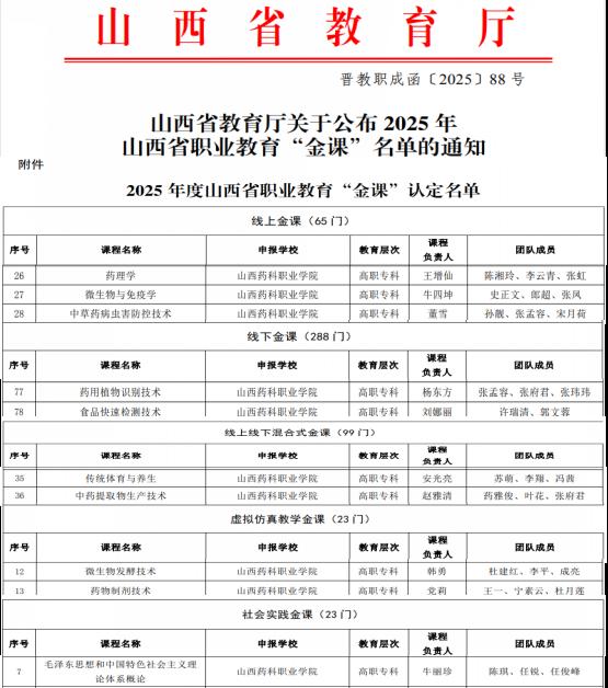 近日,山西省教育厅正式公布了2025年山西省职业教育“金课”认定名单,beat365官网凭借扎实的课程建设与教学改革成果,共有10门课程成功入选,涵盖线上、线下、线上线下混合式、虚拟仿真教学和社会实践五大类型,展现了学院在职业教育课程建设方面的综合实力与创新活力。