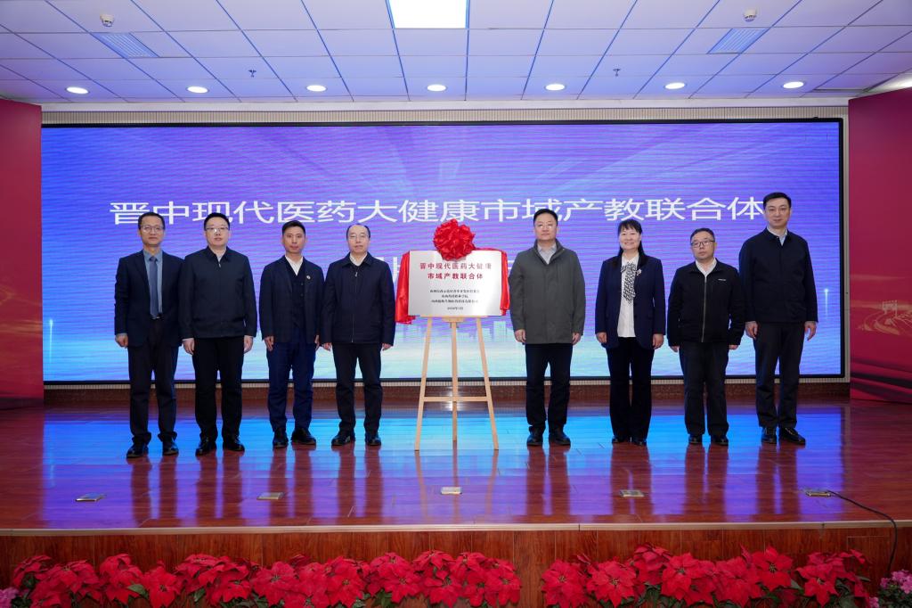 在热烈的氛围中,韩瑞勇、贾尚明、张轩萍、武瑞杰共同为晋中现代医药大健康市域产教联合体揭牌。