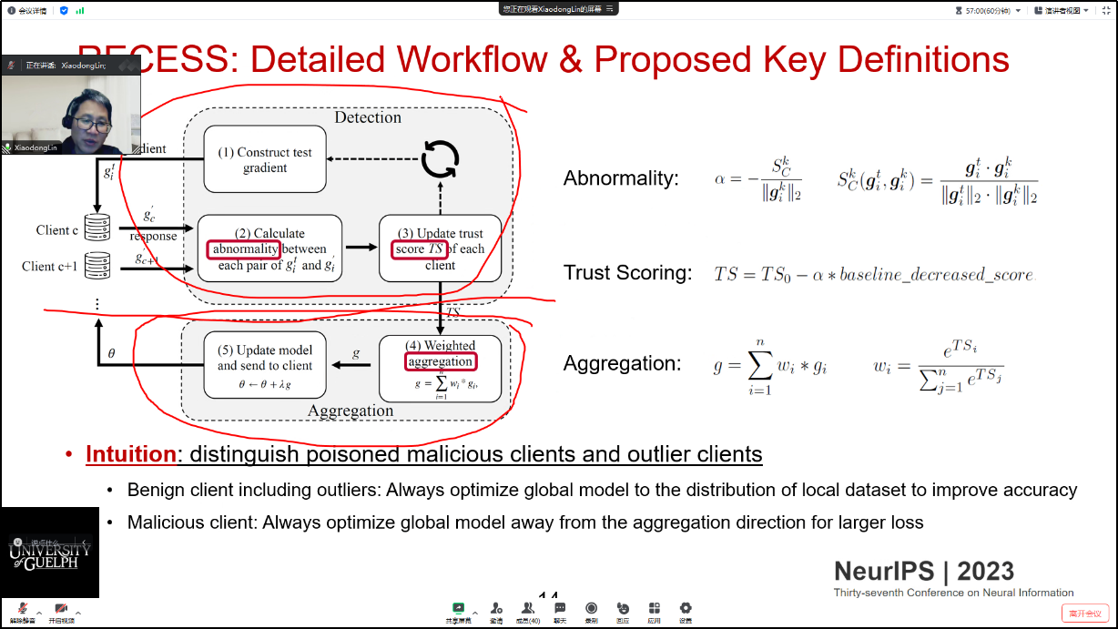 Lin教授围绕联邦学习中的安全与隐私问题,介绍了其团队发表在顶会NeurIPS 2023的最新研究成果“RECESS Vaccine for Federated Learning: Proactive Defense Against Model Poisoning Attacks”。RECESS是一种新的针对模型中毒攻击的主动防御机制,其精心构建的测试梯度可以实现良性异常值和恶意异常值的正确区分,进而完成对恶意客户端的主动检测。此外,RECESS还使用了一种新的信任评分机制以实现梯度的鲁棒聚合,进一步提升了系统容错能力。