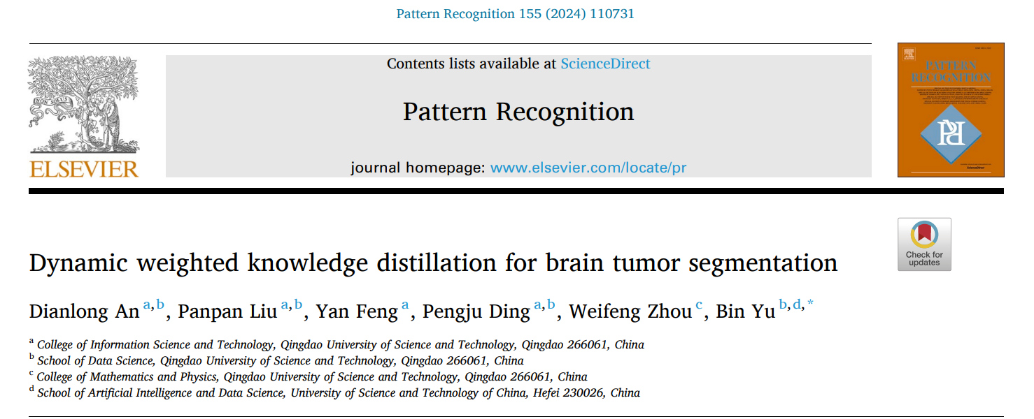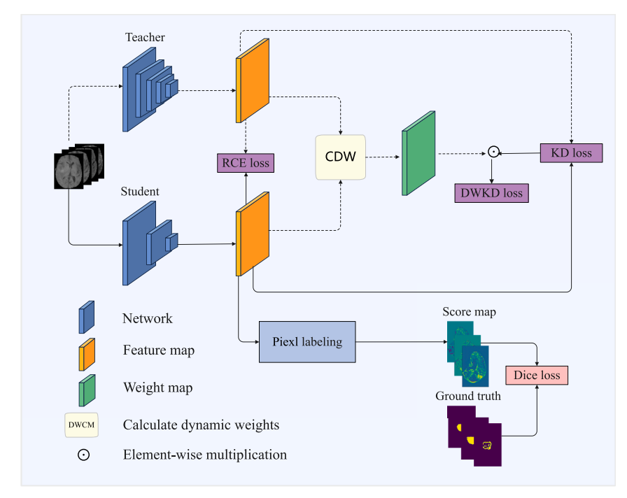 近日,KY开元集团官网入口KY开元集团官网入口2021级研究生安典龙在人工智能领域顶级期刊Pattern Recognition (IF=7.5) 发表了题为“Dynamic Weighted Knowledge Distillation for Brain Tumor Segmentation”的高水平论文,报道了压缩脑肿瘤模型的算法——DWKD。该算法在压缩脑肿瘤模型上表现出非常优秀的性能。