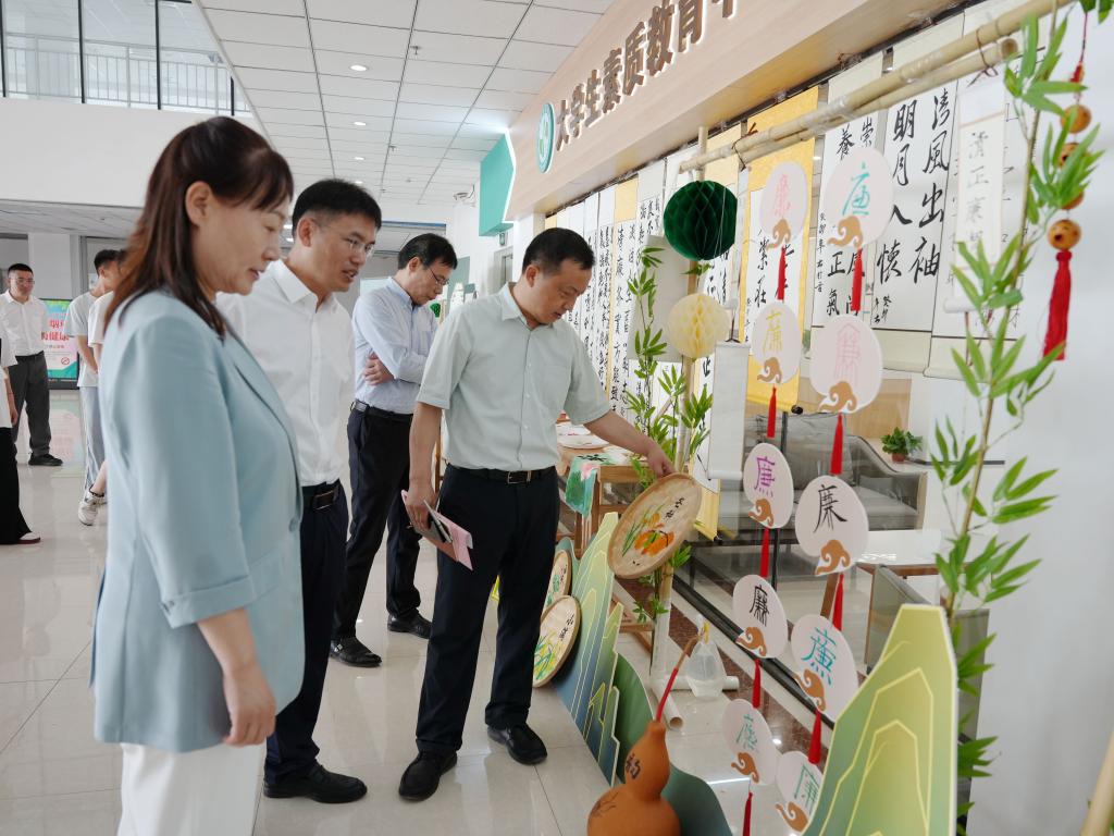 618日,学院领导王旭、张轩萍、庄东军、刘志伟、原超在综合楼二楼参观了廉洁文化教育活动月大学生廉洁教育系列作品征集优秀作品展,并对活动开展给予充分肯定。王旭指出,要结合当前开展的学习贯彻习近平新时代中国特色社会主义思想主题教育和清廉学校建设,认真落实《关于加强新时代廉洁文化建设的意见》,充分运用师生喜闻乐见方式,广泛开展丰富多彩的廉洁文化教育活动,以文化人、以廉润心,为建设全国一流药科职业院校,营造风清气正的育人环境提供坚强文化支撑。
