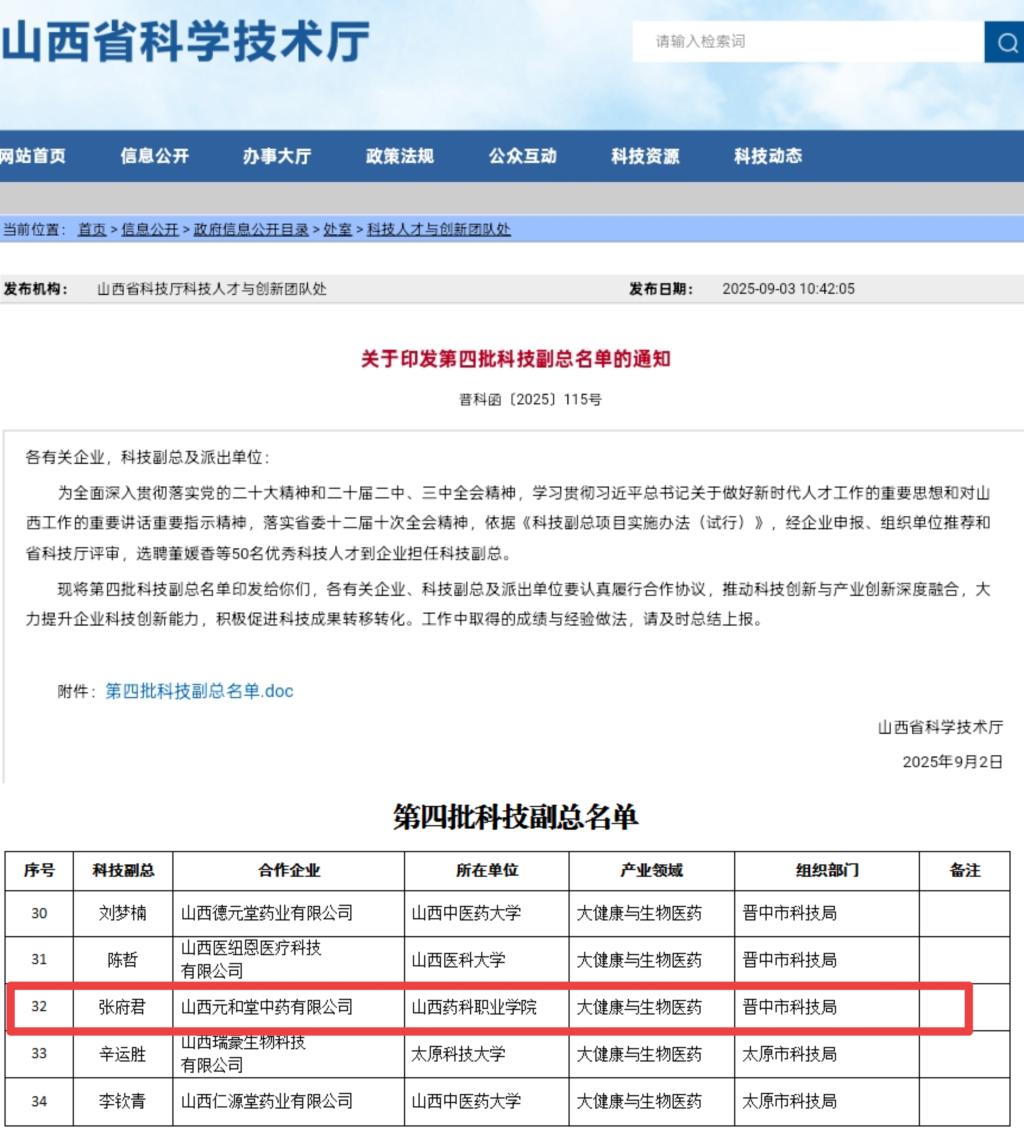 近日,山西省科学技术厅公布了第四批科技副总入选名单,beat365官网中药系骨干教师张府君副教授凭借深厚的学科积淀和丰富的实践经验以及在产学研融合方面的突出表现,成功获聘为山西元和堂中药有限公司科技副总。