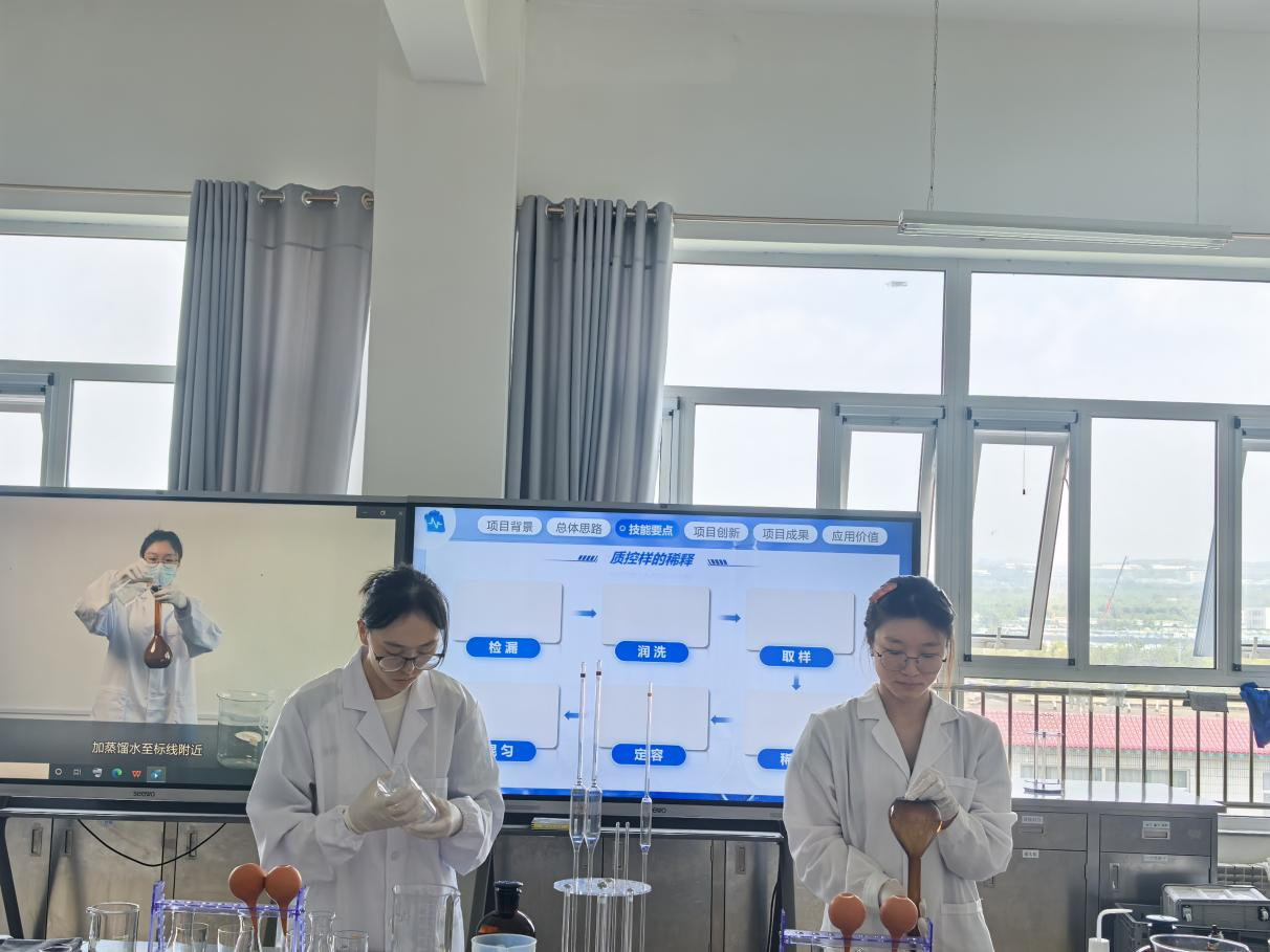 甄会贤、台晶杰团队中,张心悦在中药薄层色谱鉴别环节操作流畅,移液稳、点样准,最终以“斑点清晰、无拖尾”的表现赢得评委好评。任润子在药品性状检查的口头汇报中,语速适中、吐字清晰,关键信息突出,现场表现沉稳,展现了扎实的专业功底。