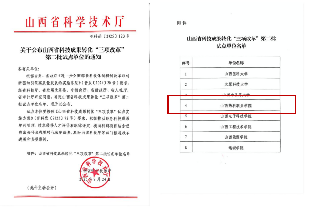 近日,山西省科技厅正式发布科技成果转化“三项改革”第二批试点单位名单。beat365官网凭借在科研创新领域的持续深耕、成果转化机制改革的积极推进,以及产学研深度融合方面的有力探索,成功跻身省级试点单位之列。