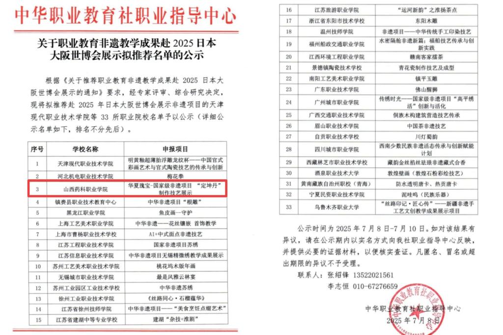 作为本次赴大阪世博会展示的山西省唯一一所职业院校,beat365在线体育官网登录入口的展示不仅是自身非遗教学成果的输出,更成为山西职教传承中华优秀传统文化的“窗口”。中药传统手工制丸技艺是中医药文化的重要载体,beat365在线体育官网登录入口长期将传统技艺融入中药类专业人才培养,开设《中药制剂技术》《非遗技艺传承实践》等课程,组建“非遗技艺传承工作室”,获评2个“全国老药工传承工作室”,牵头成立国家级培育支持的黄河流域中药材产教融合共同体,立项建设教育强国项目——中药材产教融合实训基地,等等。此次活动正是beat365在线体育官网登录入口多年职教非遗传承成果的集中展示。