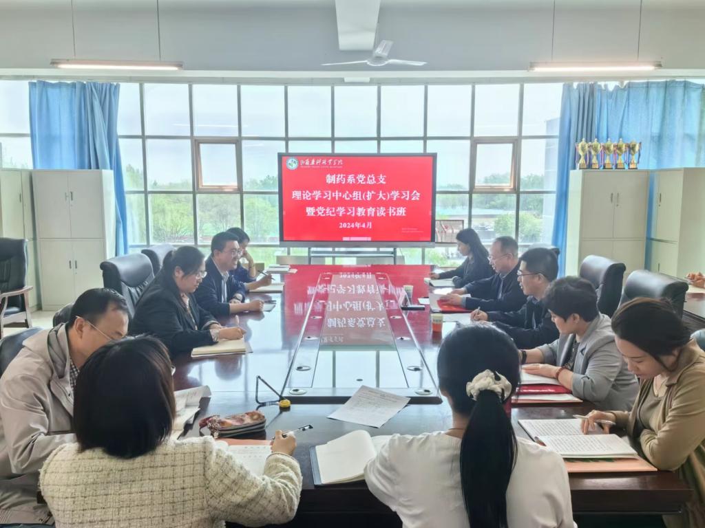 4月22日,制药系党总支召开理论学习中心组(扩大)会议暨党纪学习教育读书班,深入学习习近平总书记关于开展党纪学习教育的重要讲话和重要指示精神,贯彻落实学院党委有关部署要求,聚焦学习领会新修订的《中国共产党纪律处分条例》。会议由制药系党总支书记武江主持,学院党委副书记沈宝荣出席并讲话,食品系党总支书记申永政列席,制药系全体党员参加会议。