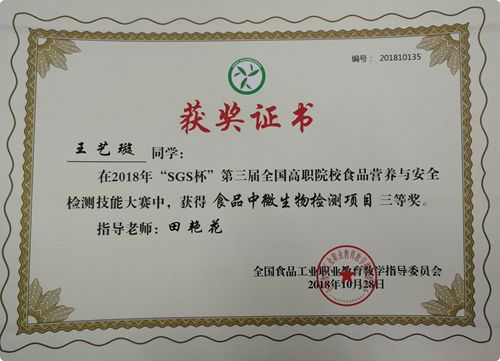 近日,2018年“SGS杯”第三届高职院校全国食品营养与安全检测技能大赛在广东轻工职业技术学院落下帷幕,beat365官网学生王艺璇荣获食品中微生物检测项目三等奖。2018-11-05 -