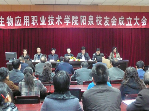 2010年11月27日,山西生物应用职业技术学院运城校友会成立大会在运城隆重召开。运城宾馆门前彩旗飘扬,红色拱门醒目耀眼,几十个祝贺单位送来的花篮分别装点在了会议室门厅和主席台两侧,一派喜气洋洋的气氛。 学院党...2010-11-28